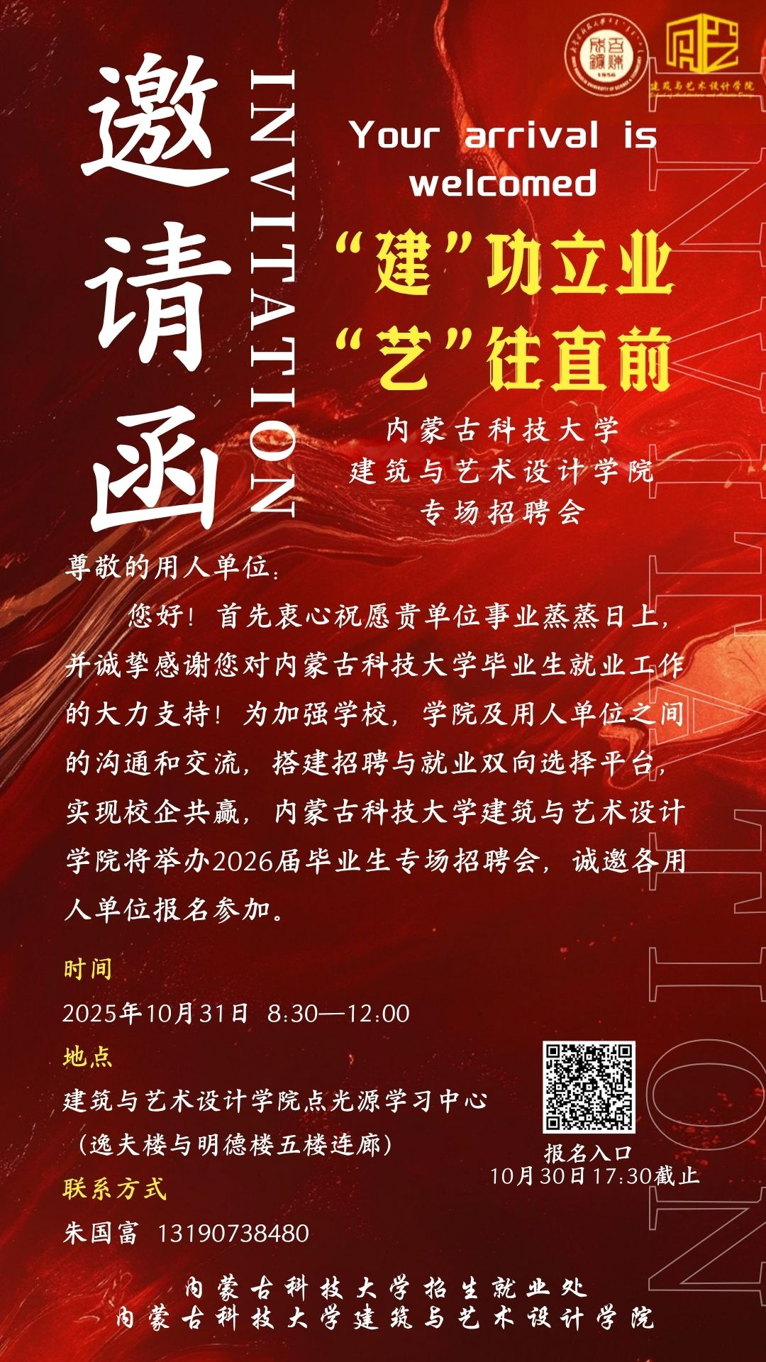 定于2025年10月31日8:30-12:00,在点光源学习中心(逸夫楼与明德楼五楼连廊) 举办2026届毕业生专场招聘会,诚邀各用人单位莅临甄选英才!