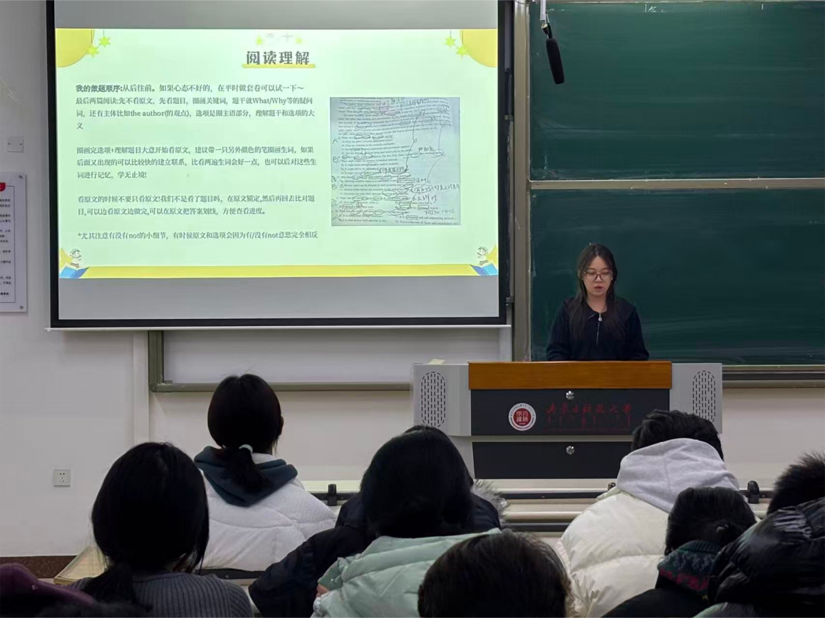 本次活动邀请23级视觉传达设计专业段慧同学主讲,她紧扣最新考试趋势,在现场深入拆解四六级考试结构、分值分布及评分标准,用直观的逻辑梳理让同学们快速掌握考试核心框架。同针对高频考点和备考误区逐一答疑,给同学们带来了极具针对性的经验分享。